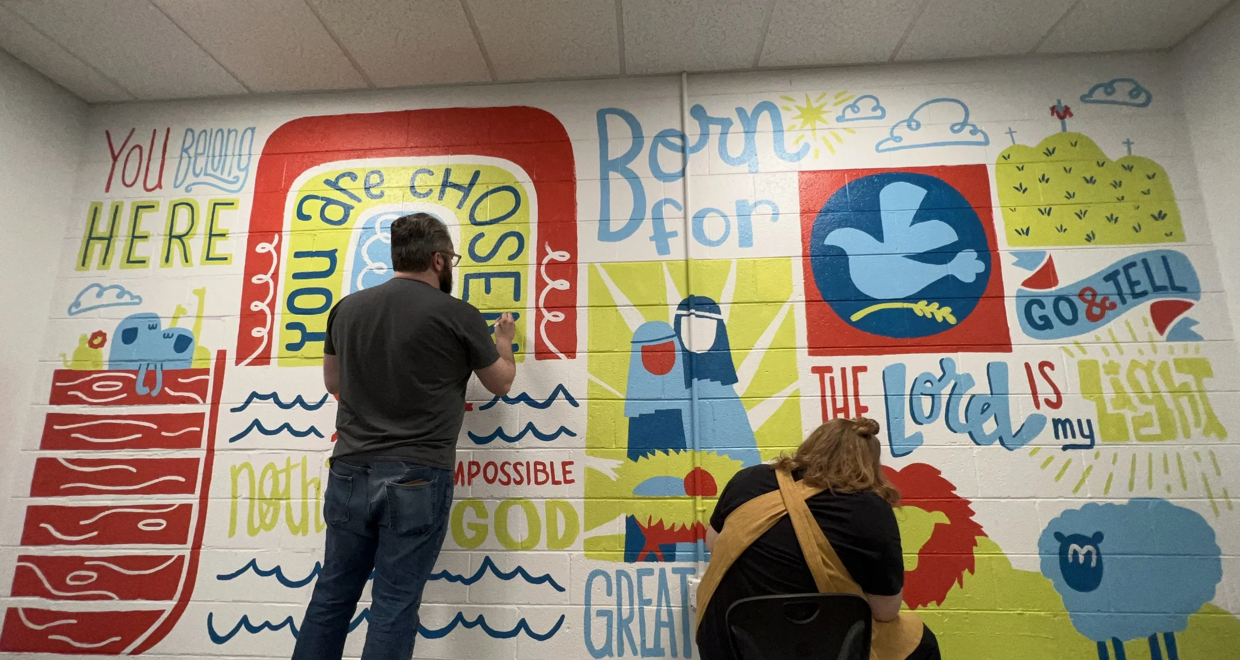 In 2022 I had the pleasure of taking on another mural for Chapel in Scott’s Addition. This time the mural was for the children’s room. The prompt was fairly straightforward. I was given text from various parts of the Bible and told to create a mural containing the text and supporting imagery. I utilized the colors that were already in use for the Chapel Kids logo. It took my wife and I (with the help of a couple of friends) 2 days to finish.